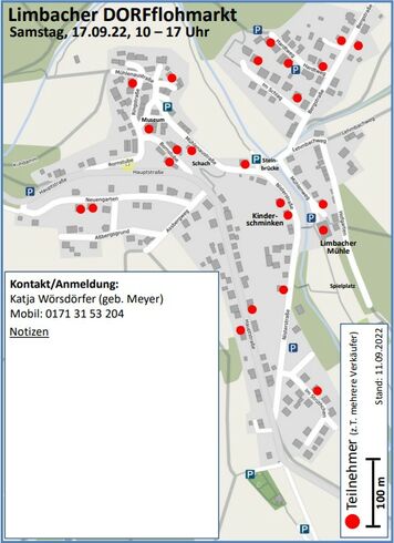 Auf Initiative der Bürgerschaft verwandelt sich das WanderDORF Limbach am kommenden Samstag, den 17. September, von 10:00 Uhr bis 17:00 Uhr in einen großen DORFflohmarkt. Die Verbindung Wandern und Limbach zeigt sich dabei auch beim Flohmarkt. Denn die in Häusern, Garagen und Scheunen aufgebauten Stände verteilen sich über den ganzen Ort und können mithilfe einer Karte „erwandert“ werden.
