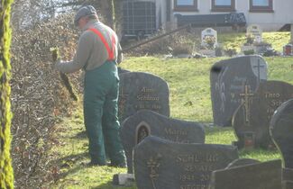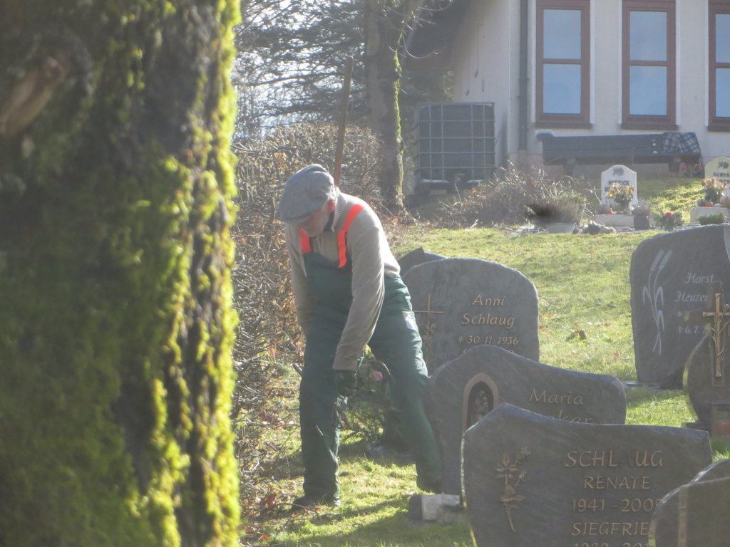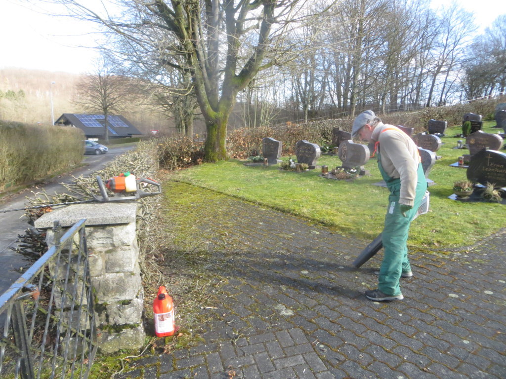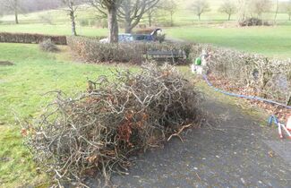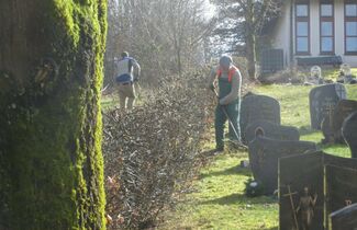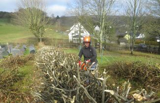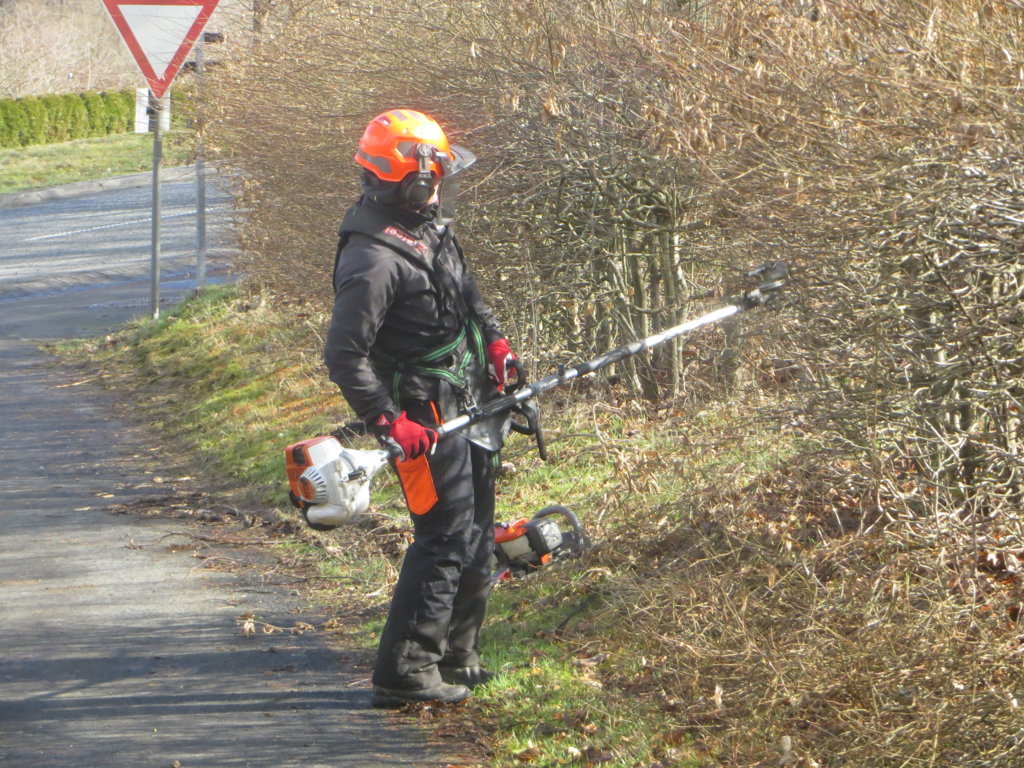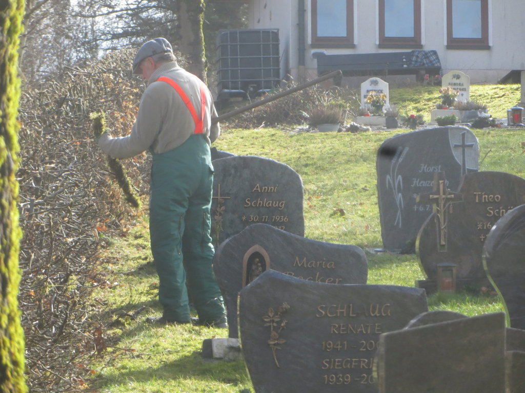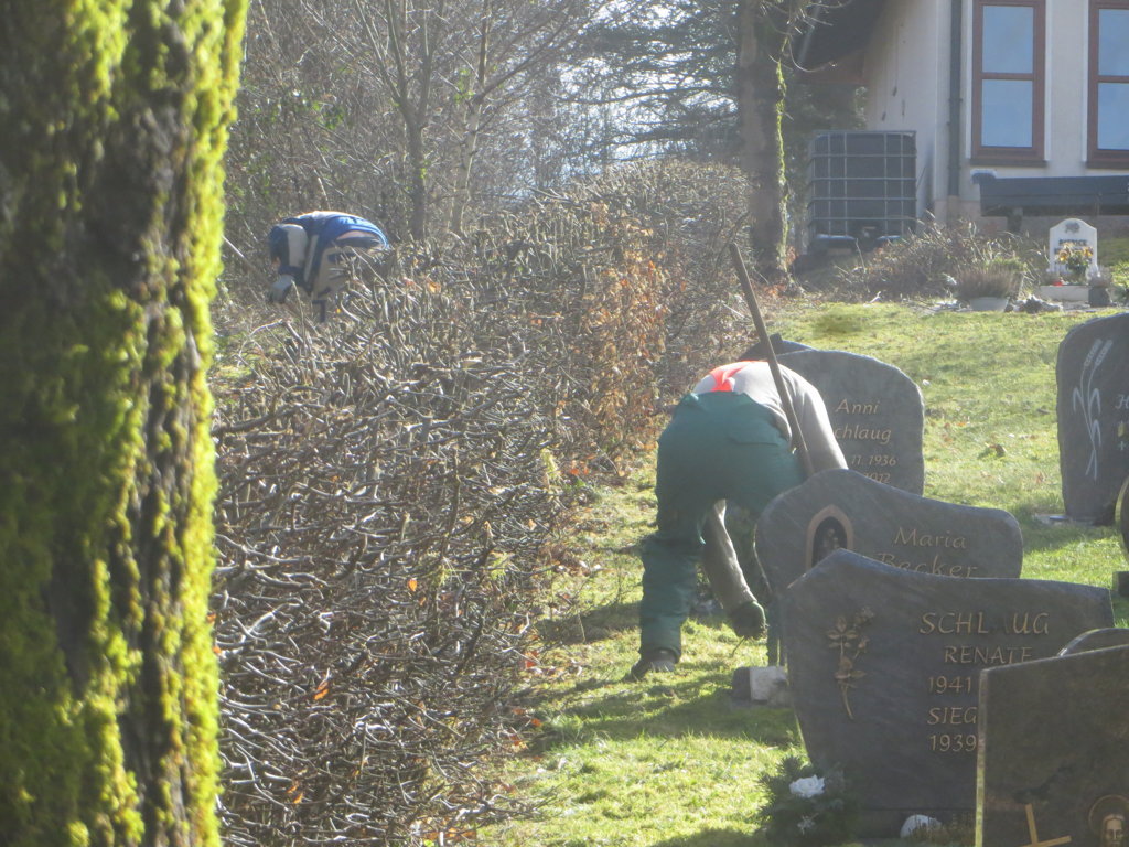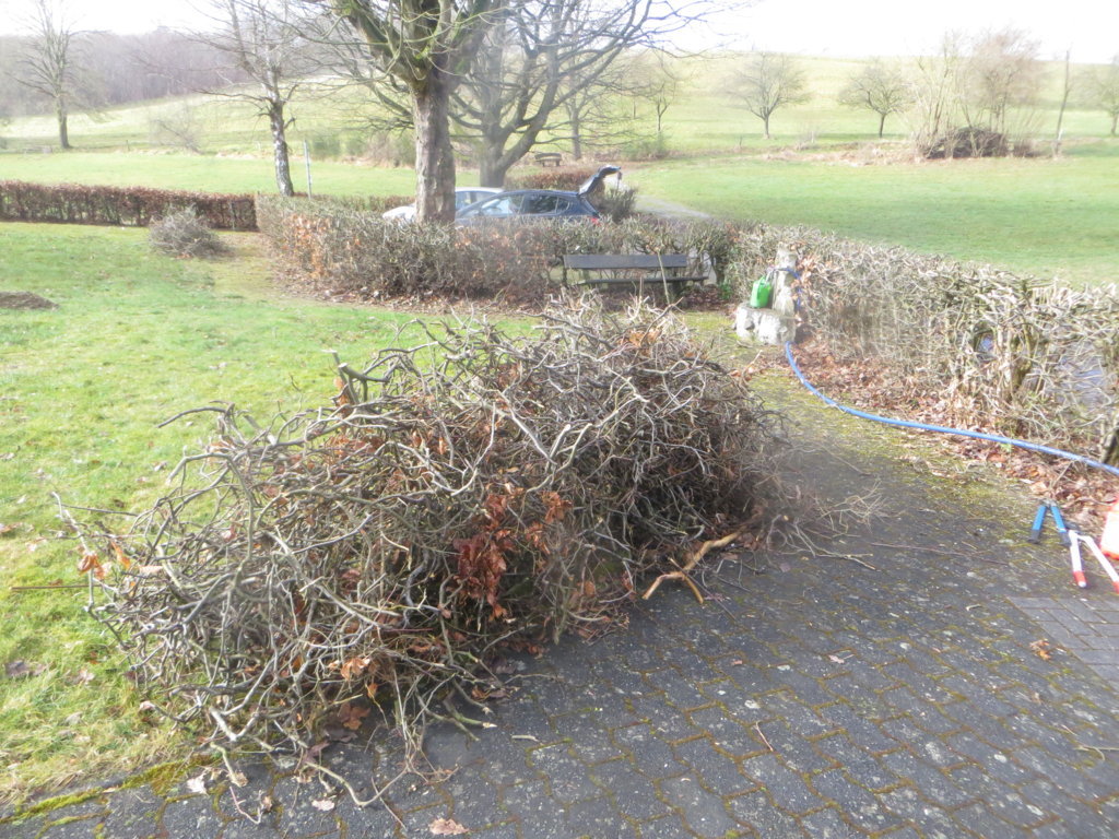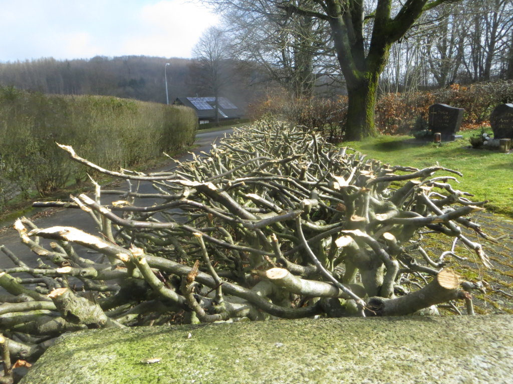 Die rechte Hälfte der Friedhofshecke war bereits vor einem Jahr auf „Hüfthöhe Julia“ eingekürzt worden. Ende Februar nun wurde die Motorsäge erneut angeschmissen um auch die linke Hälfte auf das neue Heckenmaß zu stutzen. Künftig lässt sich die gefühlt 1 km lange Buchenhecke nun wieder leicht(er) mit einer normalen Heckenschere schneiden. Zumal bei der Gelegenheit auch der Drahtzaun in der Hecke entfernt wurde. Statt diesem wurde die Hecke an „luftigen“ Stellen mit dem Schnittgut verdichtet, um gefräßige Vierbeiner vom Grabschmuck fern zu halten.