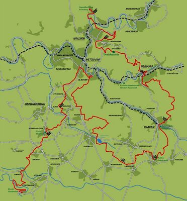 Zum anderen verkürzt sich so die letzte Etappe bis Hachenburg auf knapp 13 km. Hierdurch bleibt am Abschlusstag dann mehr Zeit zur Besichtigung der drei Etappenhighlights Dachschiefergrube Assberg, Kloster Marienstatt und Landschaftsmuseum Westerwald bzw. des barocken Städtchens Hachenburg.