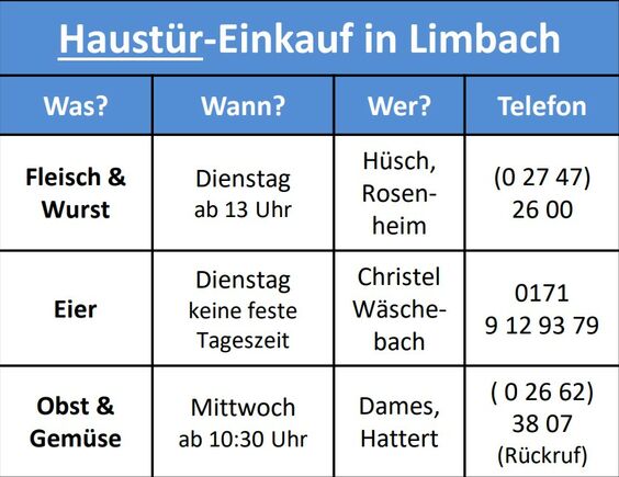 Wochentags (Mo-Fr) bieten Busverbindungen direkt ab Limbach Fahrten nach Hachenburg sowie zu den benachbarten Dörfern Atzelgift/Streithausen und Luckenbach. Eine aktuelle Übersicht findest Du hier...