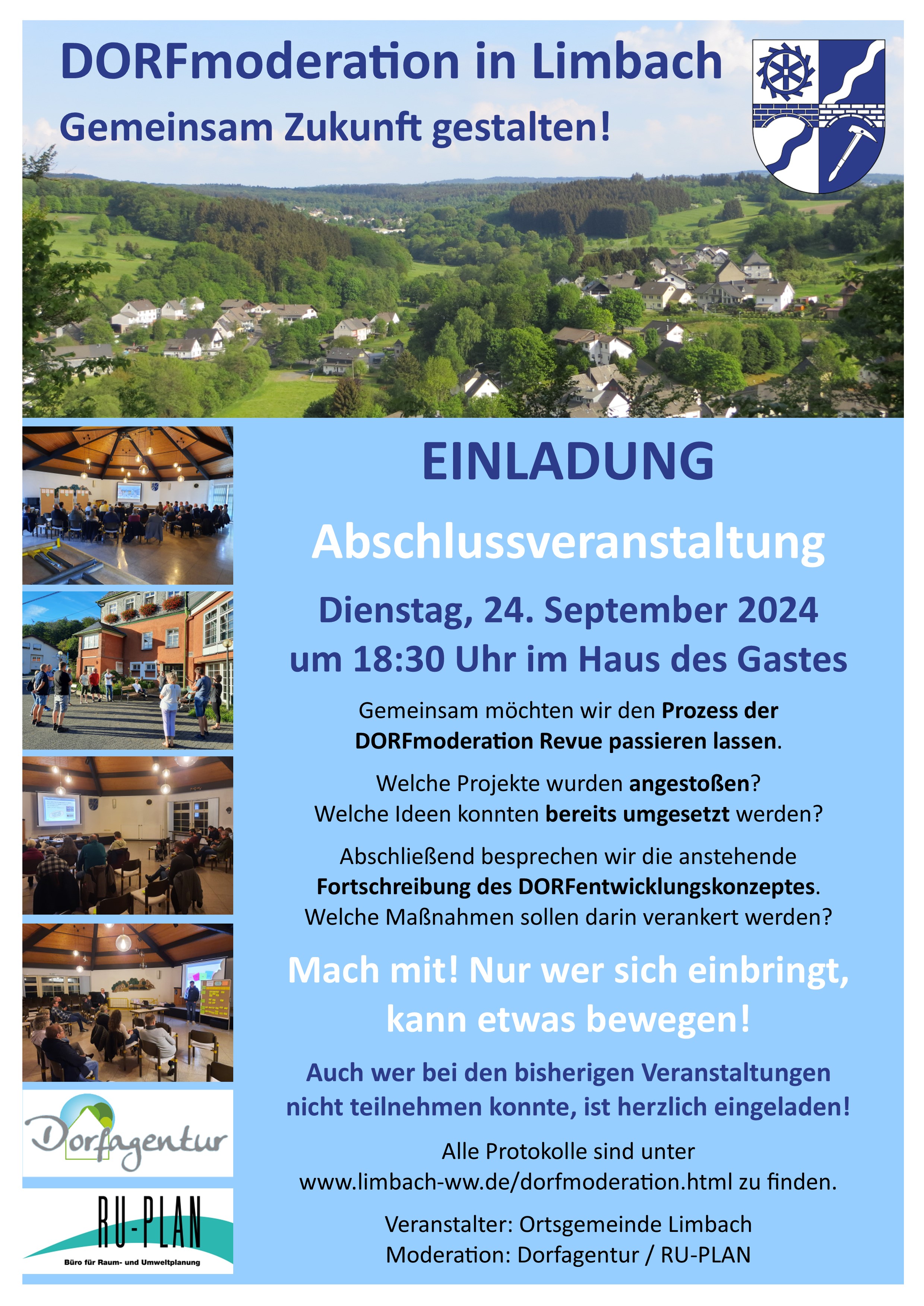Am Dienstag, den 24. September 2024, um 18:30 Uhr, findet im Haus des Gastes die Abschlussveranstaltung der DORFmoderation statt. Alle Bürgerinnen und Bürger sind herzlich eingeladen, gemeinsam auf den erfolgreichen Prozess der DORFmoderation zurückzublicken.