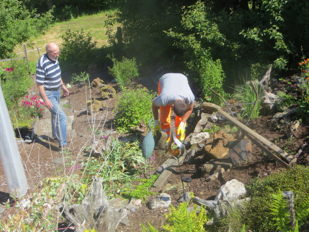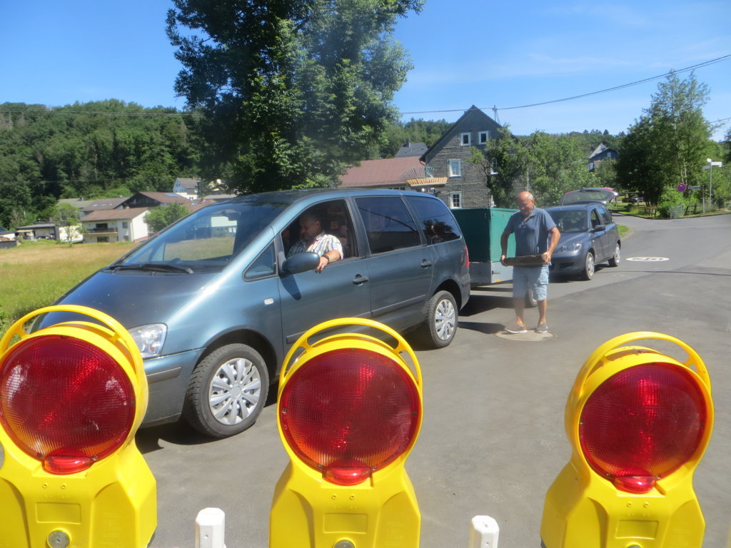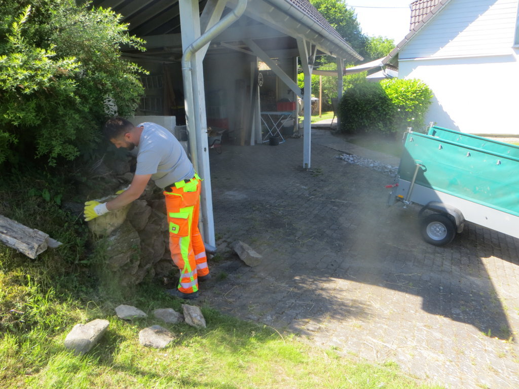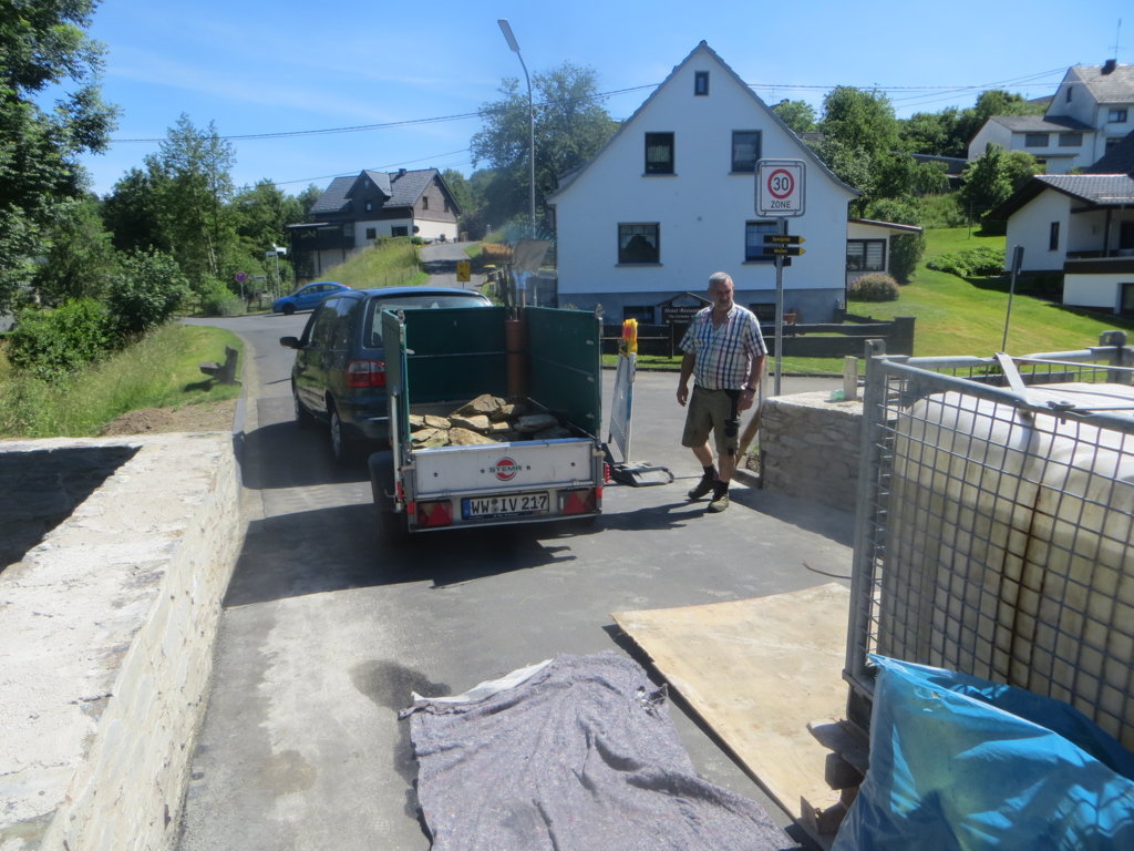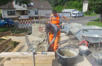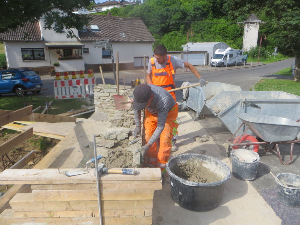 Ein Aufruf zur „Steinspende“ in der WhatsApp-Gruppe „Limbach aktuell“ genügte und innerhalb von Minuten rollte der Steinnachschub an: Stefan (Müller) etwa gab seinen letzten Stein, Gabriel (Schneider) sowie Eckhard und Ute (Schumacher) halfen mit „Großspenden“ und dank Adam (Rehl) fanden auch Steine der Limbacher Mühle in der Brücke eine Zweitverwendung. Herzlichen Dank euch und allen anderen Spendern! Gegen 11 Uhr wurden die ersten Steine bereits in die Brüstung eingebaut.