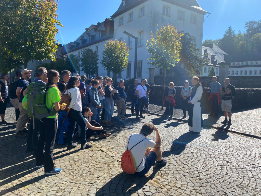 Über die Nistermühle, wo natürlich auf den Aufenthalt von Konrad Adenauer 1944 hingewiesen wurde, ging es nach Marienstatt, das über sein Mutterkloster Heisterbach ebenfalls Verbindungen in den Bonner Raum hat. Nach einer „Besichtigungspause“ und kurzer Begrüßung führte Prior-Administrator Pater Benedikt in den Klostergarten, wo Frater Bernhard die vom Kloster sehr angetanen Besucher mit einem Korb knackiger Äpfel überraschte. Direkt am Ufer der Großen Nister nutzte Manfred Fetthauer anschließend die Gelegenheit der illustren Gästeschar die erfolgreiche Arbeit „seiner“ ARGE Nister vorzustellen. Wenig überraschend stieß er damit auf großes Interesse, besonders auch das der Ministerin.