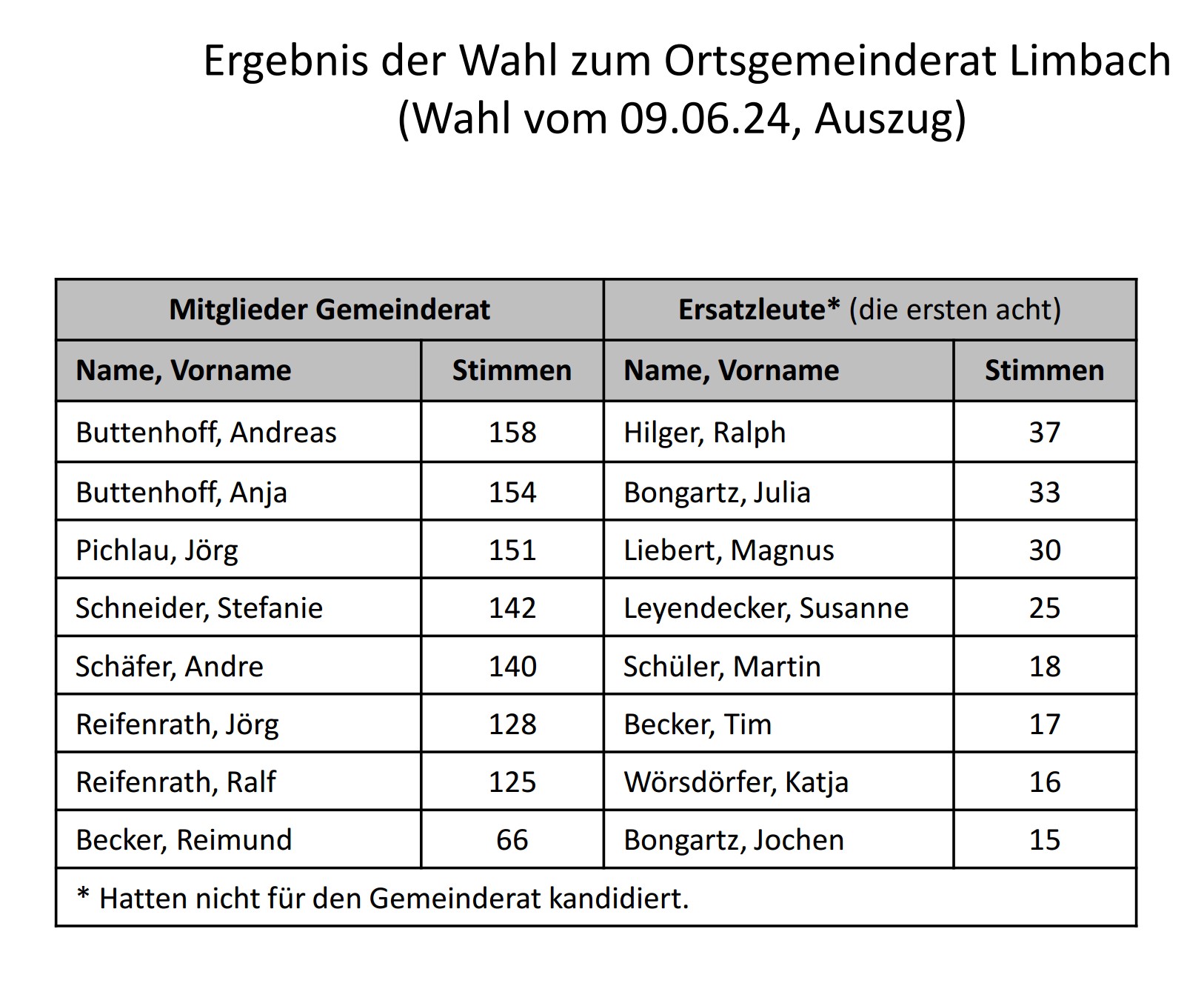In seiner Sitzung am 10. Juni hat der Limbacher Wahlausschuss in öffentlicher Sitzung die Endergebnisse der Wahlen zu Ortsbürgermeister und Ortsgemeinderat amtlich festgestellt.