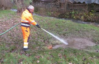 Professionell und äußerst engagiert (siehe Foto) sorgte der Fachmann für freien Abfluss. Und zwar allein mit Wasser, das sich mit hohem Druck und speziellen Schlauchaufsätzen den Weg durch die verstopften Rohre bahnte. Bei einem Schacht stieß diese Technik allerdings an ihre Grenzen. Denn hier waren Wurzeln in das Rohr hineingewachsen. Mit dem richtigen Werkzeug konnte aber schließlich auch dieses Rohr frei gemacht werden.