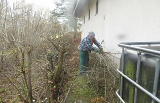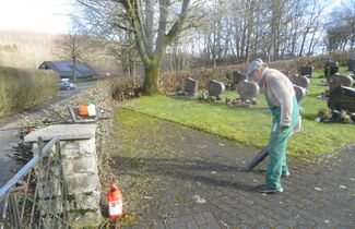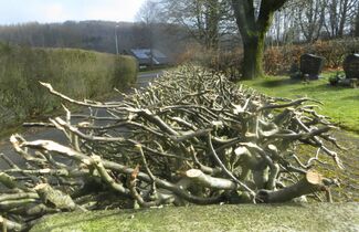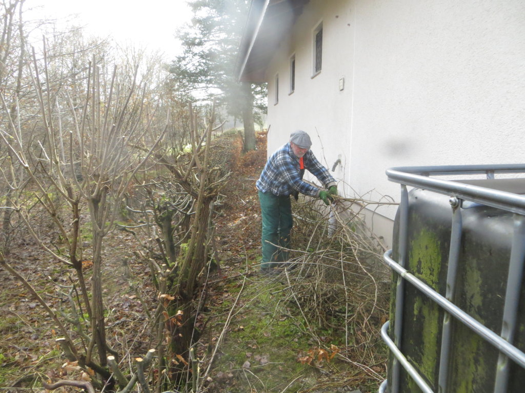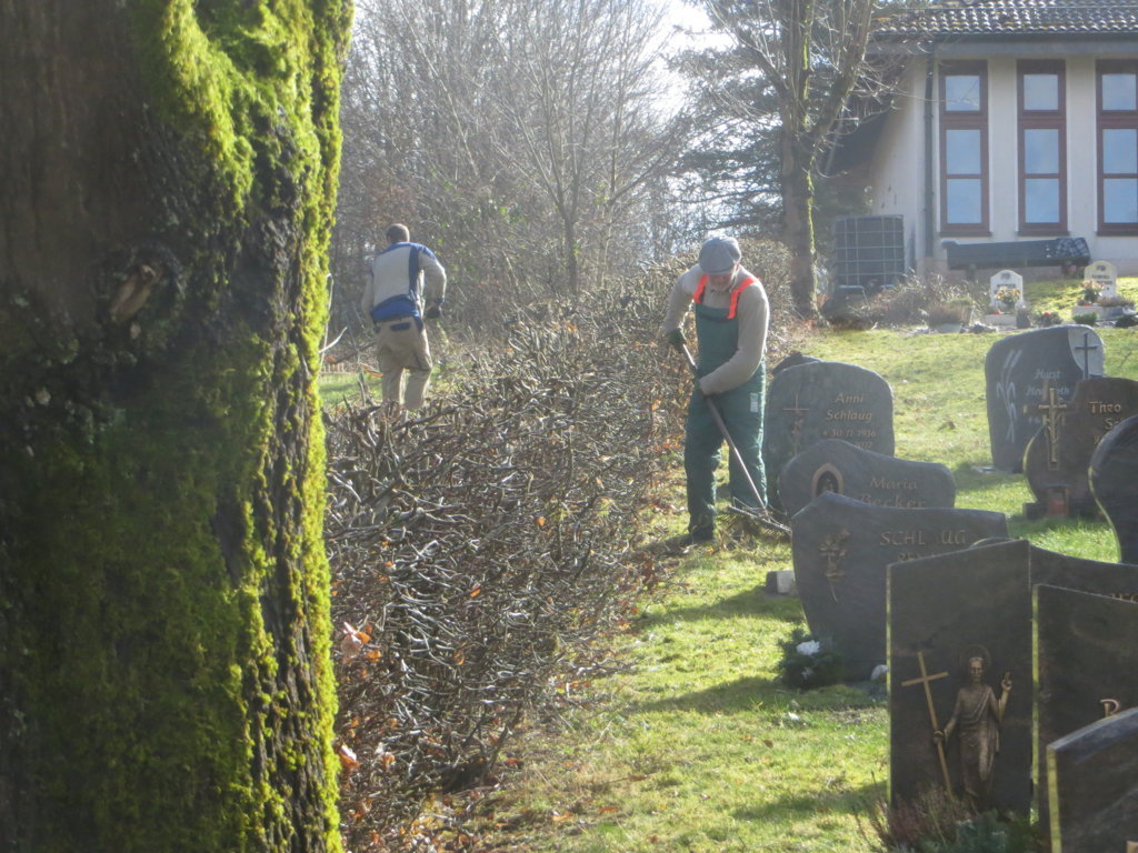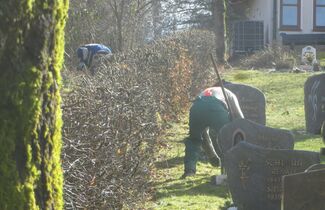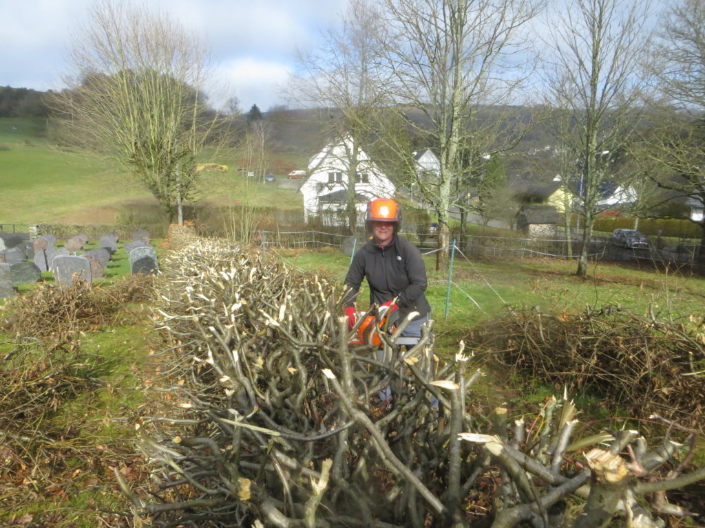 Die rechte Hälfte der Friedhofshecke war bereits vor einem Jahr auf „Hüfthöhe Julia“ eingekürzt worden. Ende Februar nun wurde die Motorsäge erneut angeschmissen um auch die linke Hälfte auf das neue Heckenmaß zu stutzen. Künftig lässt sich die gefühlt 1 km lange Buchenhecke nun wieder leicht(er) mit einer normalen Heckenschere schneiden. Zumal bei der Gelegenheit auch der Drahtzaun in der Hecke entfernt wurde. Statt diesem wurde die Hecke an „luftigen“ Stellen mit dem Schnittgut verdichtet, um gefräßige Vierbeiner vom Grabschmuck fern zu halten.