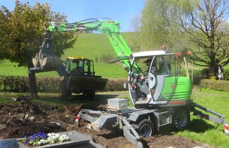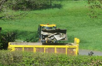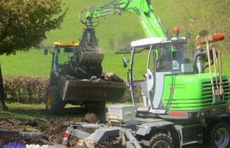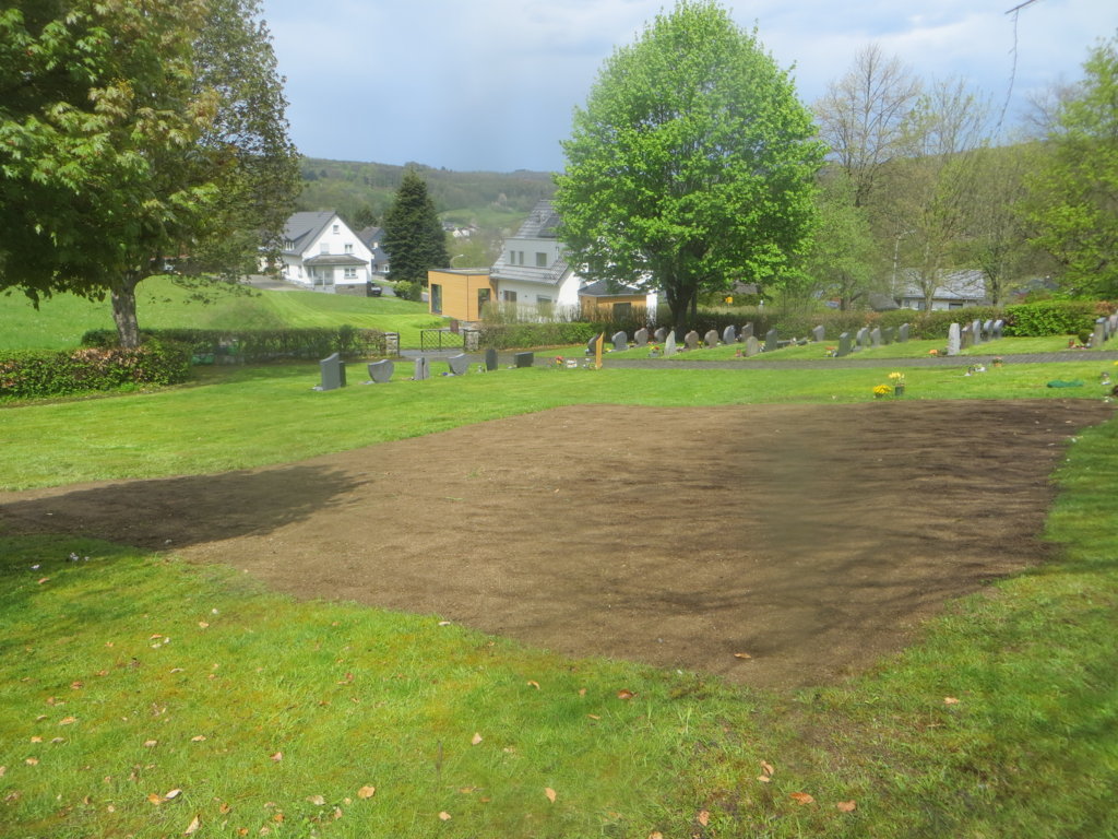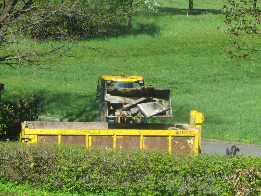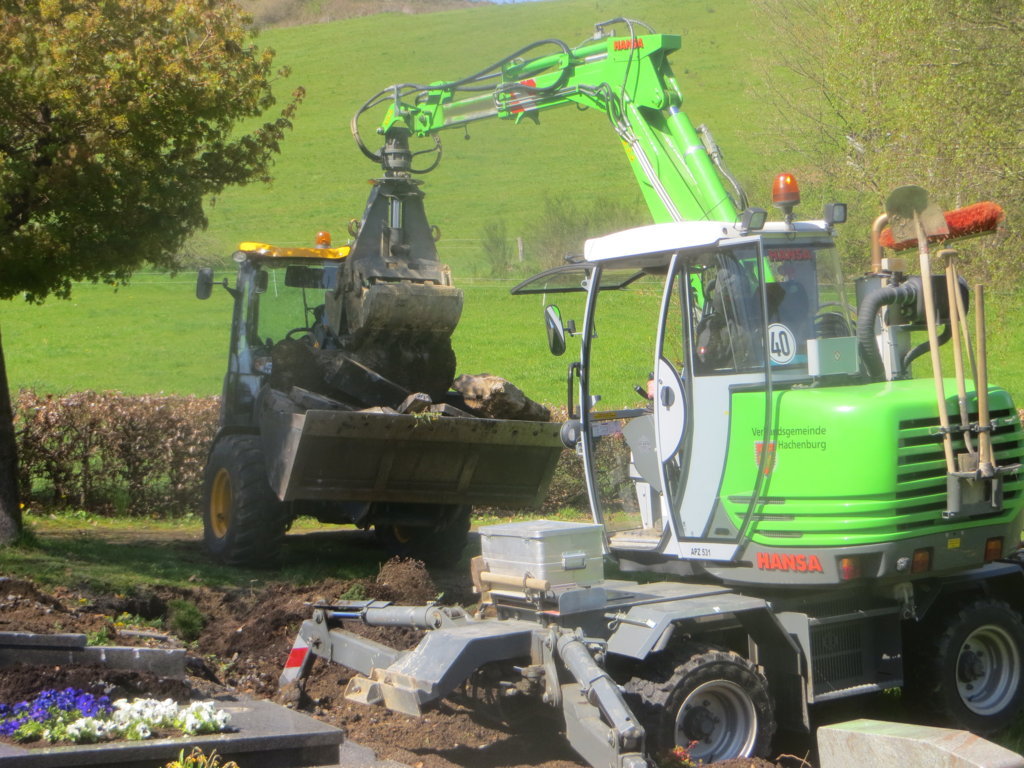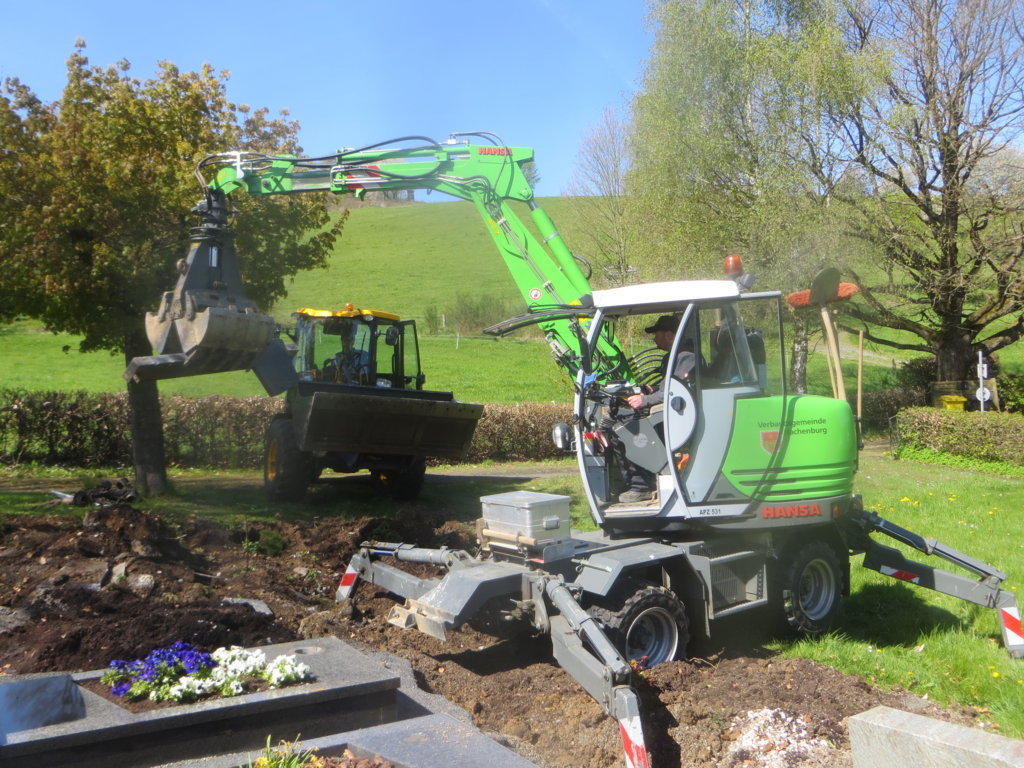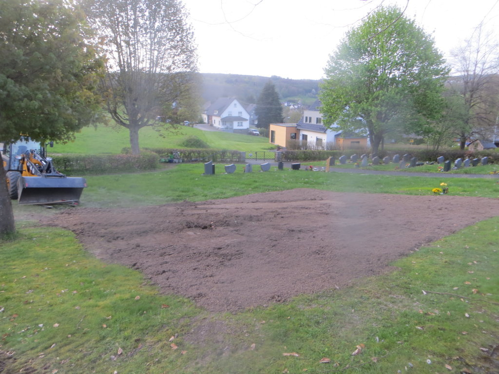 Bei trockenem Wetter konnte in der ersten Maiwoche das Grabfeld C auf unserem Friedhof geräumt werden. Dominik (Scholtz) und Christian (Recatala) vom Bauhof der Verbandsgemeinde waren mit schwerem Gerät angerückt und leisteten ganze Arbeit: Nachdem alle Metallteile und restlicher Grabschmuck entfernt war, wurden Grabsteine und –einfassungen inklusive der Betonfundamente mit dem Bagger herausgerissen und zum Recycelen in einen bereitstehenden Container verladen. Abschließend wurde die Fläche mit Mutterboden verfüllt und eingesät.