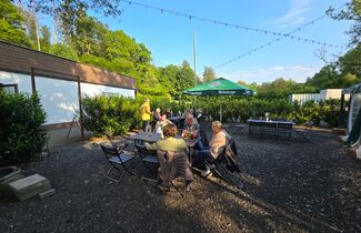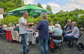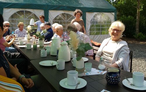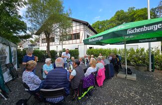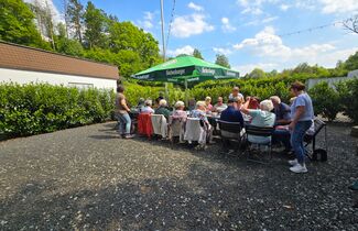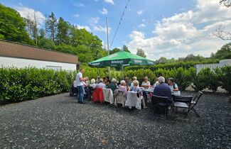 Alle Nervosität und alles Bangen waren überflüssig. Denn besser hätten die Premiere der DORFkneipe und der Neustart des DORFcafés in Schänke und Biergarten der Limbacher Mühle kaum laufen können. Mit Aussicht auf ein leckeres Stück selbstgebackenen Kuchen ließen sich auch die beiden Altbürgermeister Leyendeckersch Heinz (88) und Al Schul Herbert (Hilger, 97) nicht zweimal bitten und waren in Begleitung ihrer ehemaligen „First Ladies“ Anni und Hildegunde ebenfalls gekommen. Zwar klang bei einem Teilnehmer ein wenig Wehmut mit, als er meinte, „fröa hamma off da Müll Bier getronken. Heut setze ma he bei Kaffi un Koochen.“ Doch auch er genoss bei bestem Sommerwetter im Kreise der gut 25 Teilnehmer einen kurzweiligen, geselliger Kaffeeklatsch mit viel Quatschen und Lachen am Ufer der Kleinen Nister. Besonders viel Ausdauer bewies ein „Jungsenior“ aus dem Neuengarten, der nahtlos vom DORFcafé zur DORFkneipe hinüberwechselte.