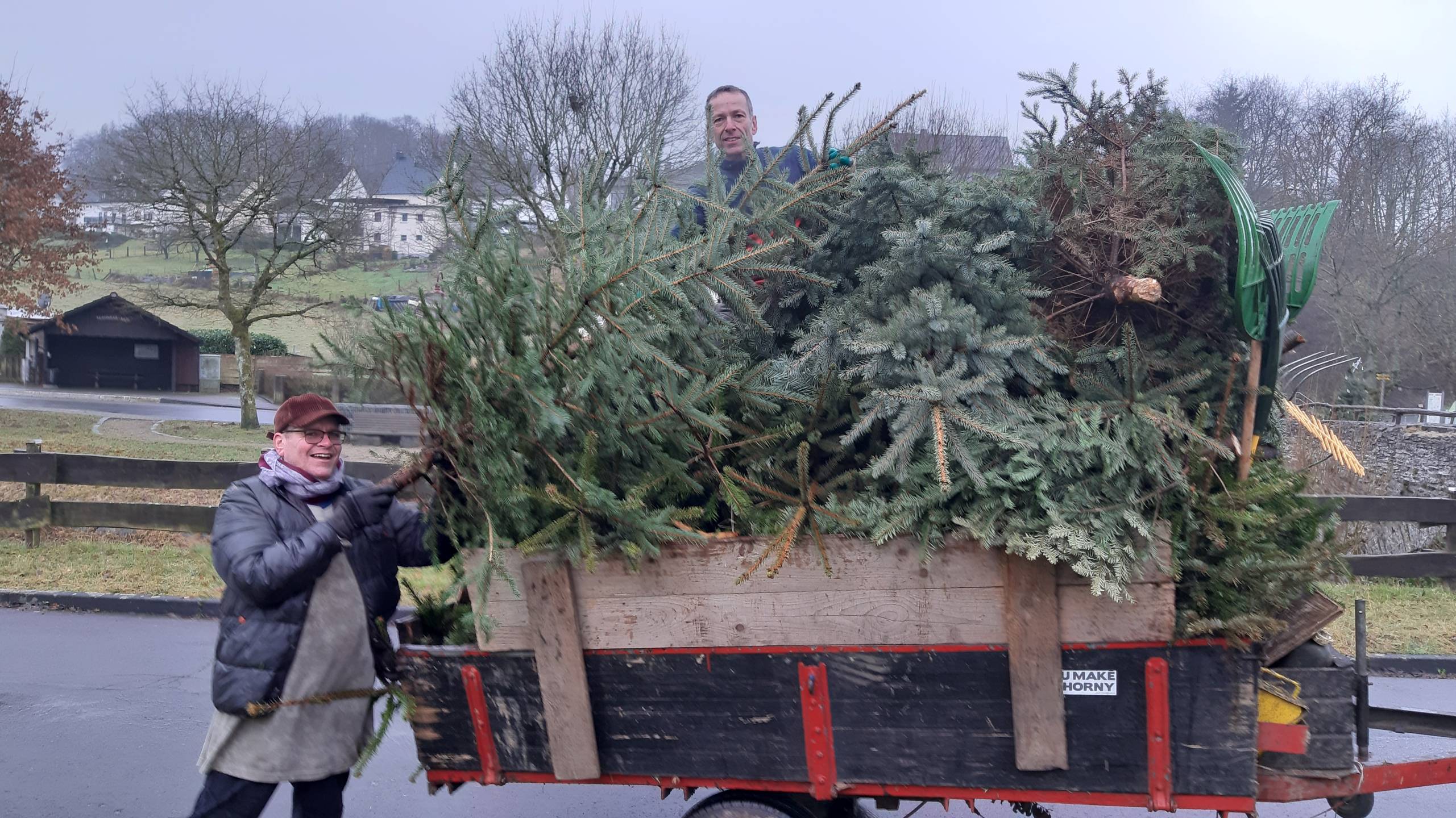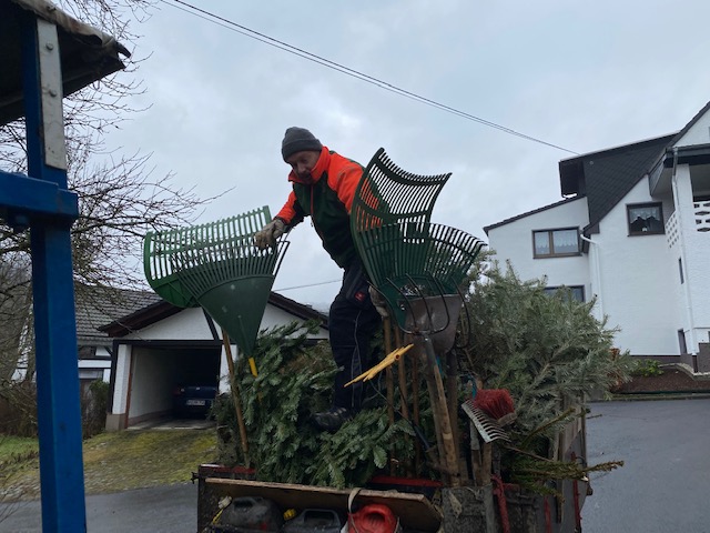 Vom (fast) Bonsaibäumchen bis zur 3-Meter-Tanne war alles dabei. Und allesamt vorbildlich von jeglichem Weihnachtsschmuck befreit. Das machte „Team 1“ mit Bürgermeister und den Ratsmitgliedern Jörg (Reifenrath) und Michael (Hütter) die Arbeit leicht(er), sodass bereits am Vormittag das komplette Dorf abgefahren war.
