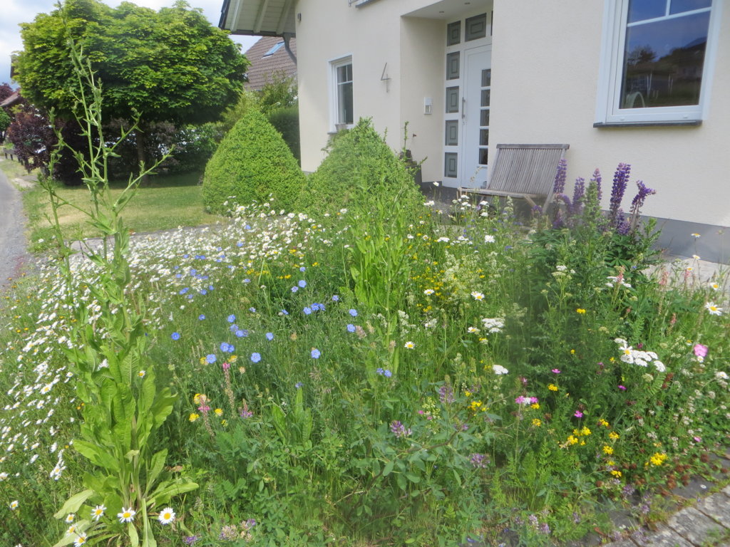 Doch hat auch der kurz gemähte Rasen im Garten natürlich seine Berechtigung! Und so sieht man im DORF an immer mehr Häusern ein „friedliches“ Nebeneinander von kurz rasiertem „Mähroboter-Rasen“ und einer wilden „Blumen-Kräuter-Pracht“. Ein tolles Beispiel findest Du etwa im Neuengarten (siehe Foto).