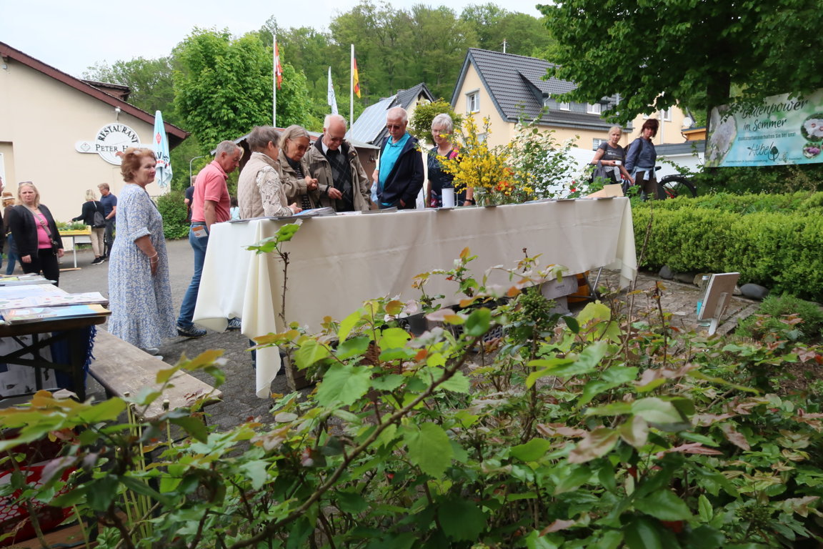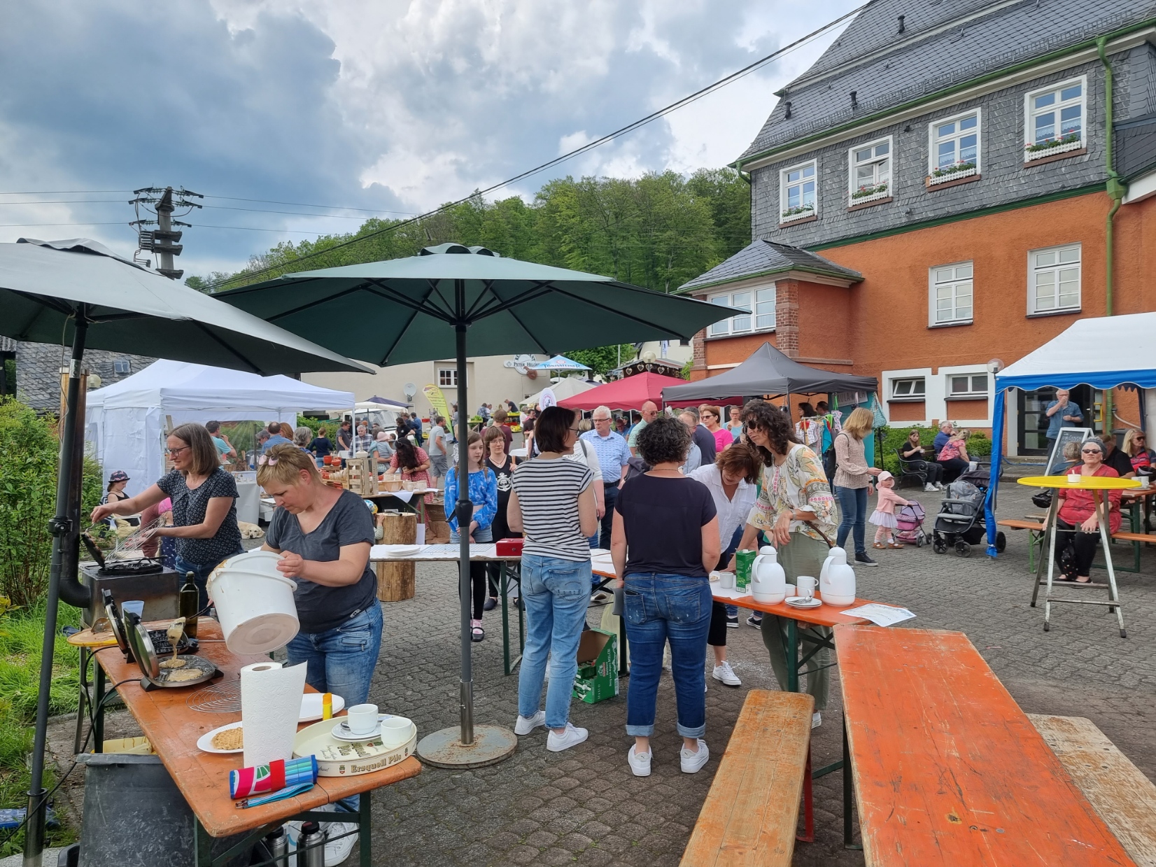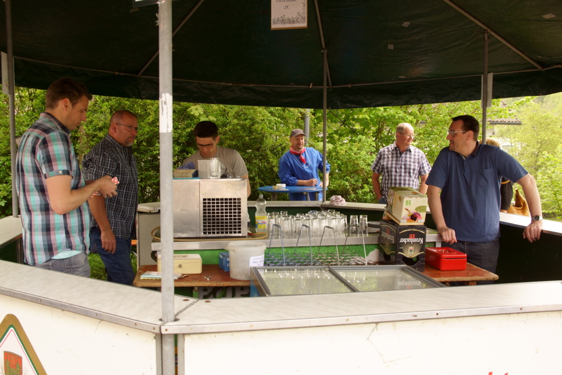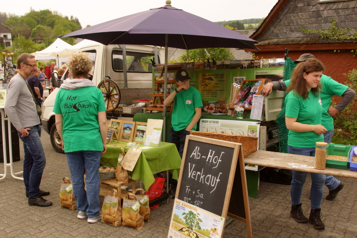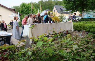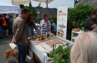 Rund zwanzig Stände mit für „ihr Ding“ spürbar begeisterten Anbietern präsentierten einen bunten Strauß an Waren ihren Westerwälder Manufakturen. So gab es im und ums Haus des Gastes neben Pflanzen und Kräutern u.a. auch Holzspiele, Töpfer- und Dekoware, Essig, Backesbrot und Alles rund ums Nähen. Peter (Hilger) und Samuel (Leonhardt) sorgten mit einer eigens für den Kräutermarkt kreierten Speisenkarte für Gaumenfreuden. Beim Dessert hatte man im Marktbereich die Qual der Wahl zwischen Waffeln nach Omas Art, selbst gebackenem Kuchen und Eis mit besten regionalen Zutaten. Die Versorgung mit Flüssigem hatten traditionell die Männer von Blau-Weiß übernommen.