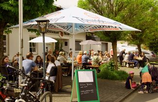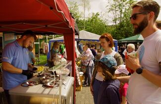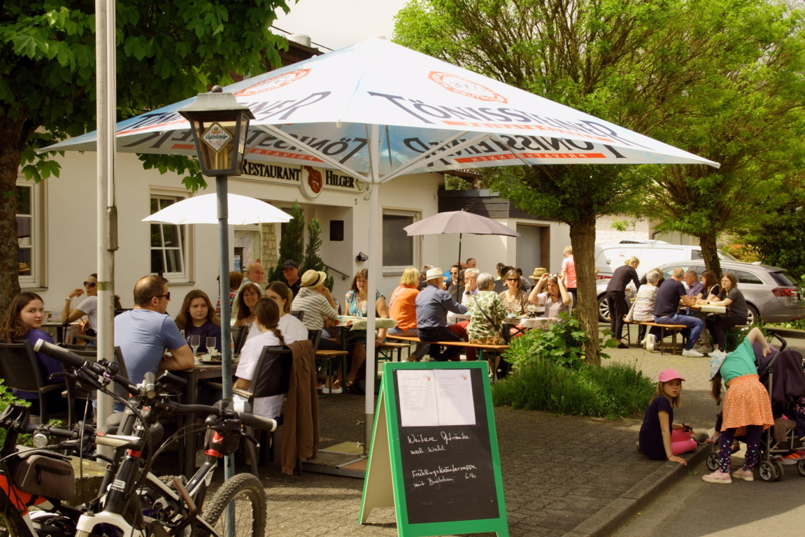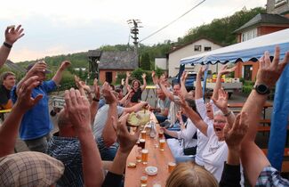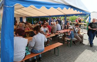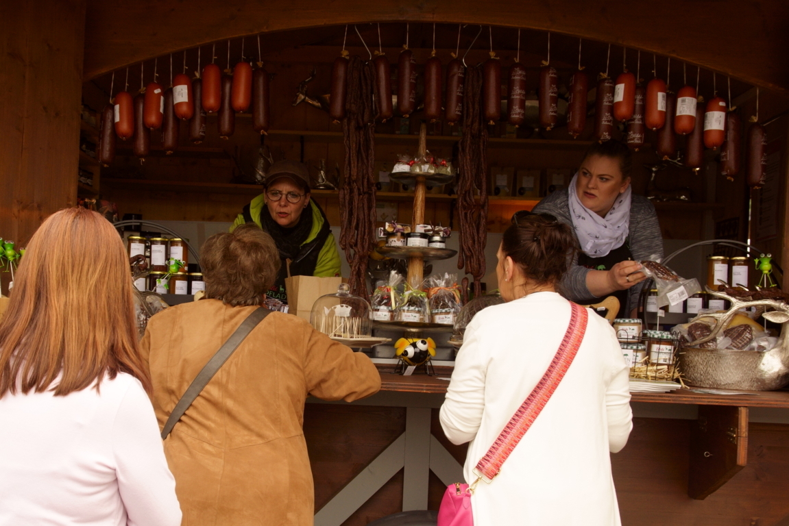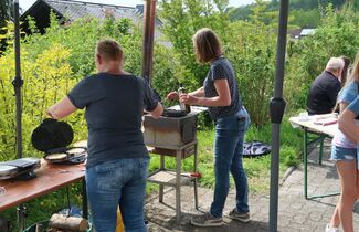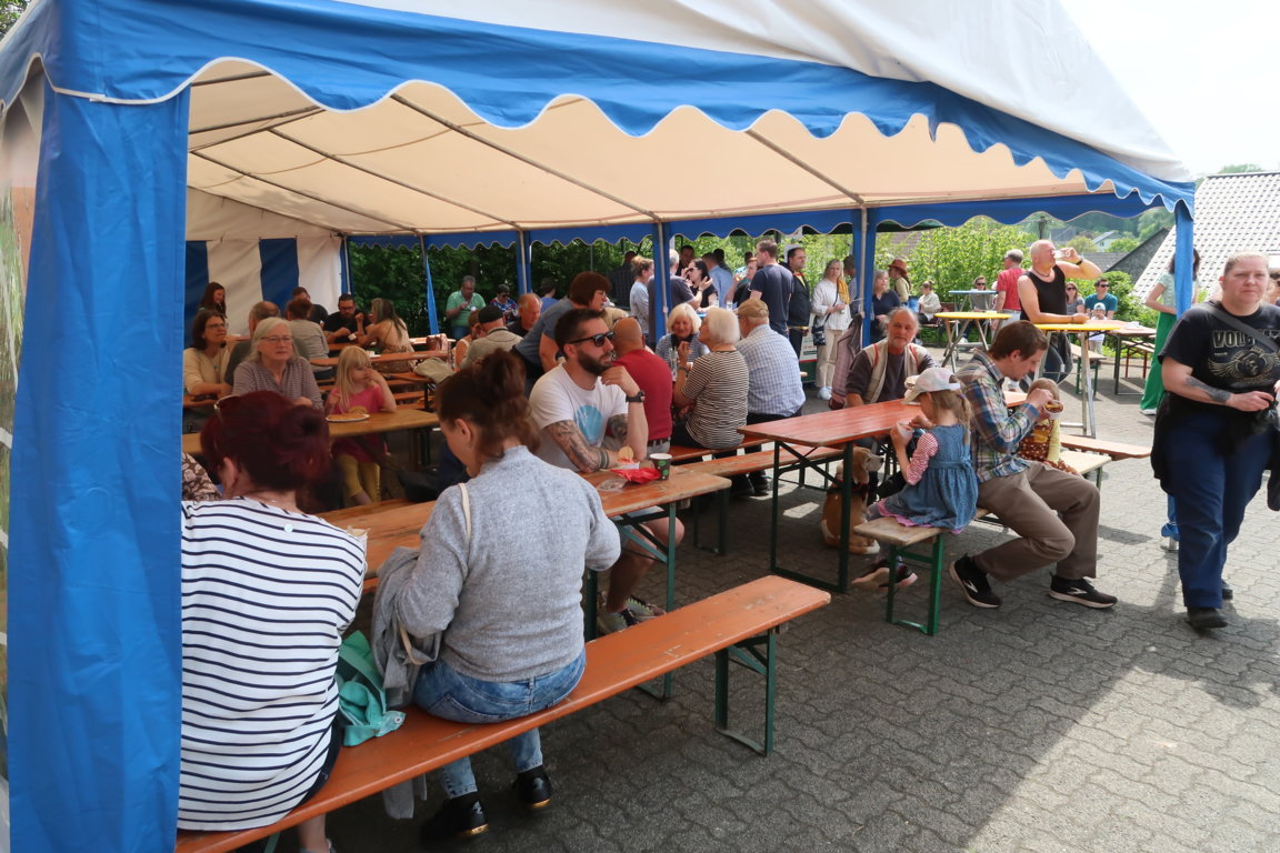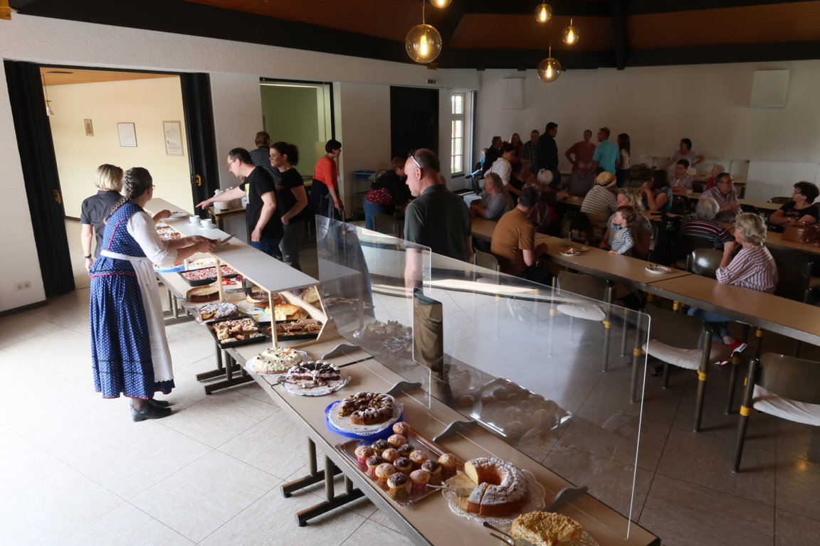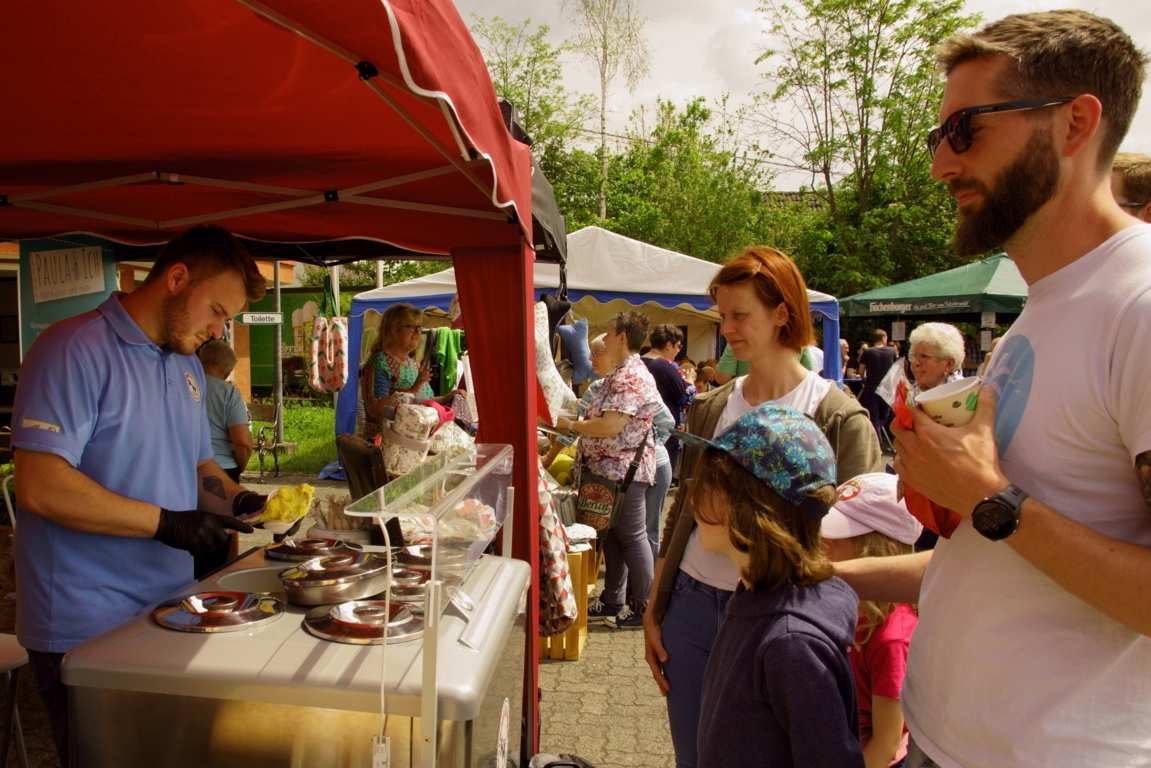 Rund zwanzig Stände mit für „ihr Ding“ spürbar begeisterten Anbietern präsentierten einen bunten Strauß an Waren ihren Westerwälder Manufakturen. So gab es im und ums Haus des Gastes neben Pflanzen und Kräutern u.a. auch Holzspiele, Töpfer- und Dekoware, Essig, Backesbrot und Alles rund ums Nähen. Peter (Hilger) und Samuel (Leonhardt) sorgten mit einer eigens für den Kräutermarkt kreierten Speisenkarte für Gaumenfreuden. Beim Dessert hatte man im Marktbereich die Qual der Wahl zwischen Waffeln nach Omas Art, selbst gebackenem Kuchen und Eis mit besten regionalen Zutaten. Die Versorgung mit Flüssigem hatten traditionell die Männer von Blau-Weiß übernommen.