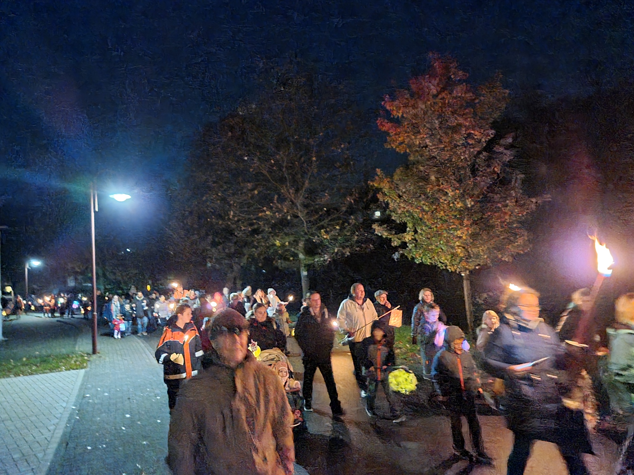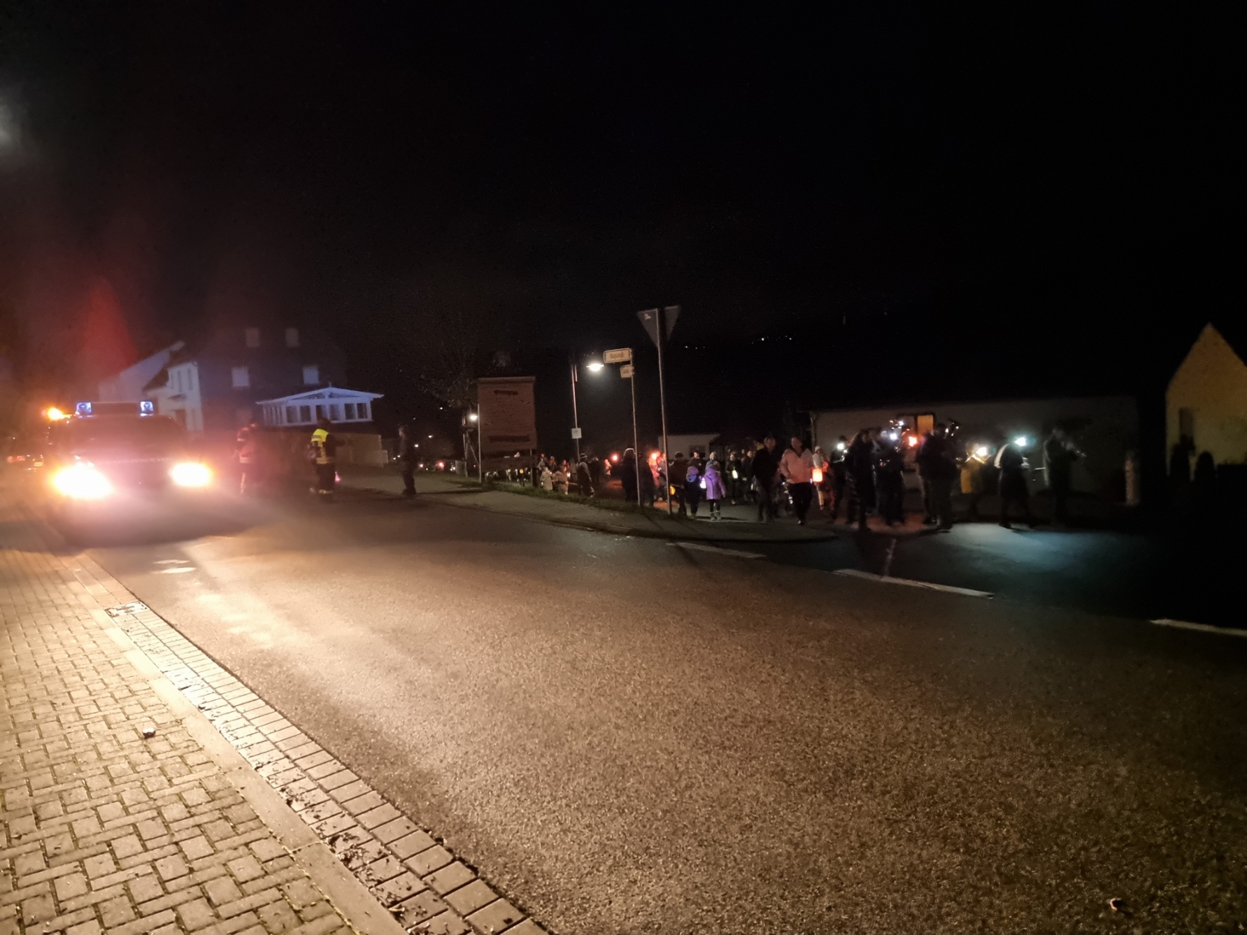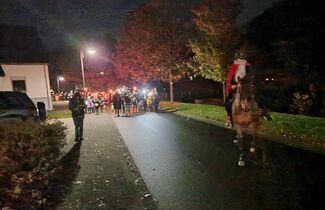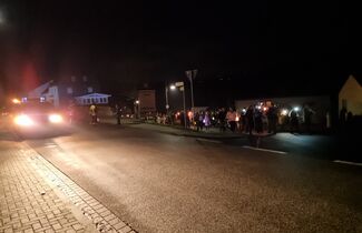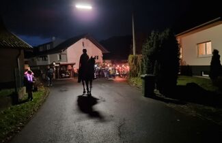 Angeführt von Sankt Martin hoch zu Ross und den Limbacher Dorfmusikanten setzte sich danach dann der diesmal besonders lange Martinszug in Bewegung. Musik, Gesang und bunte Laternen erfreuten auch viele Zuschauer in den Häusern entlang des Weges, auf dem die Luckenbacher Feuerwehr für Sicherheit sorgte. Schon von weitem sah man das Martinsfeuer brennen. Nach einigen weiteren Martinsliedern am Feuer gab es – wie am Nachmittag übrigens bereits für alle Limbacher Senioren – natürlich die obligatorischen Brezeln. Bei loderndem Feuer und bester Betreuung durch die Männer vom Sportverein genossen Klein und Groß noch länger einen rundum gelungenen Martinsabend.