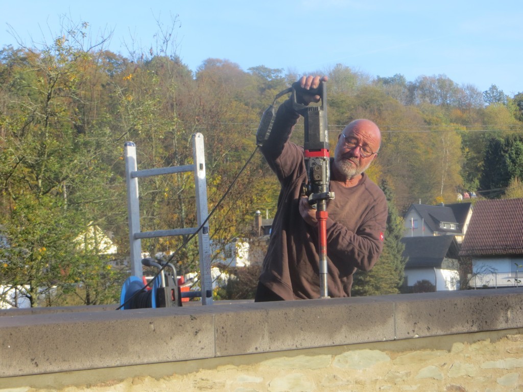 Im Rahmen der Sanierung der Steinbogenbrücke hat die Müschenbacher Firma Hehl Naturstein die Arbeiten zur Anbringung der Brüstungsabdeckung abgeschlossen. Mit drei Mann, darunter auch der Chef, kam man gut voran. Der Bruchstein des Brückenkörpers wird sich mit der Zeit farblich übrigens noch an den Basaltlava der Brüstungsabdeckung anpassen.