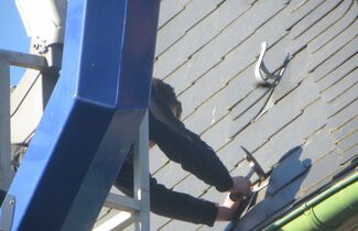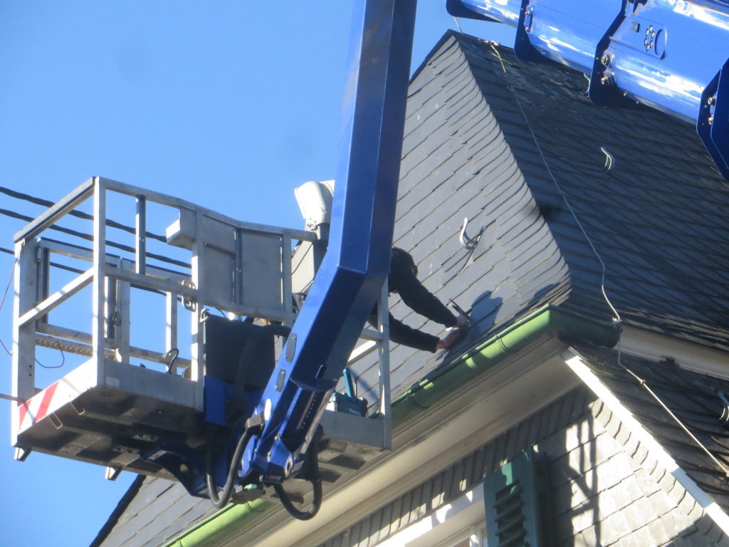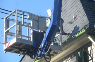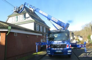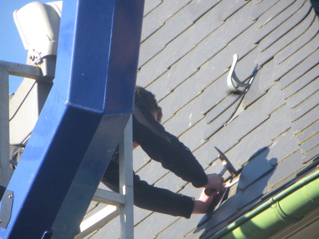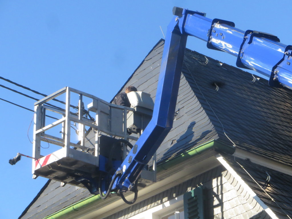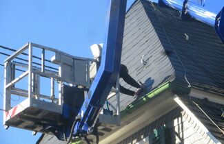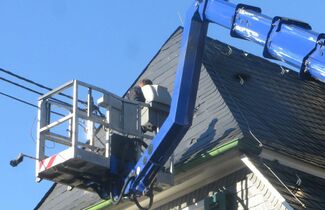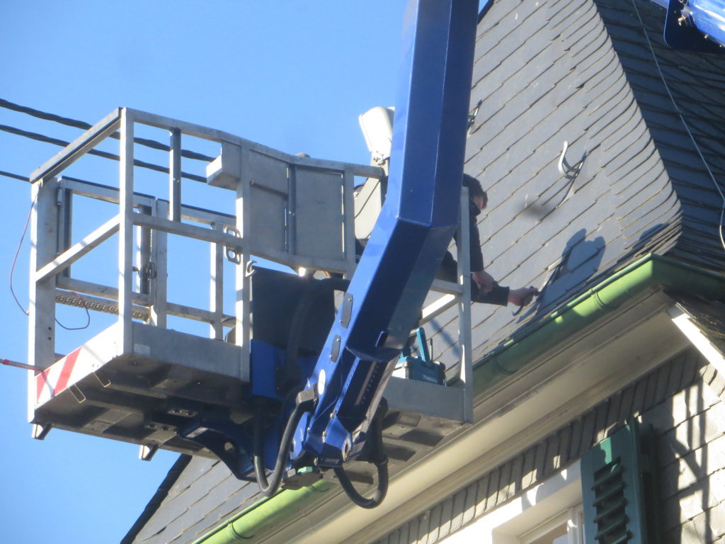 Hoch hinaus ging es dieser Tage am Haus des Gastes. Einer der vergangenen Stürme hatte am dortigen Dach gleich mehrere Schieferplatten losgerissen. Um weiteren Schaden zu verhindern kam die Firma Dachdecker Fischer aus Gehlert unverzüglich mit großem Gerät angefahren, um den Sturmschaden zu beheben, der an die Versicherung gemeldet wurde. Herzlichen Dank für die gute und rasche Ausführung nach Gehlert!