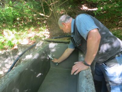 Schnell hatte der Fachmann eine Lösung parat und erfreute dann auch noch mit der Spende des Materials zum Abdichten des Armbeckens. Das machte dann ebenso schnell wie gekonnt unser Gemeindearbeiter Thomas (Weller), seines Zeichens gelernter Maurer. Nach vielen, vielen Jahren haben wir in Limbach nun nicht mehr nur ein Tretbecken, sondern endlich wieder eine Kneippanlage mit Tret- und Armbecken.